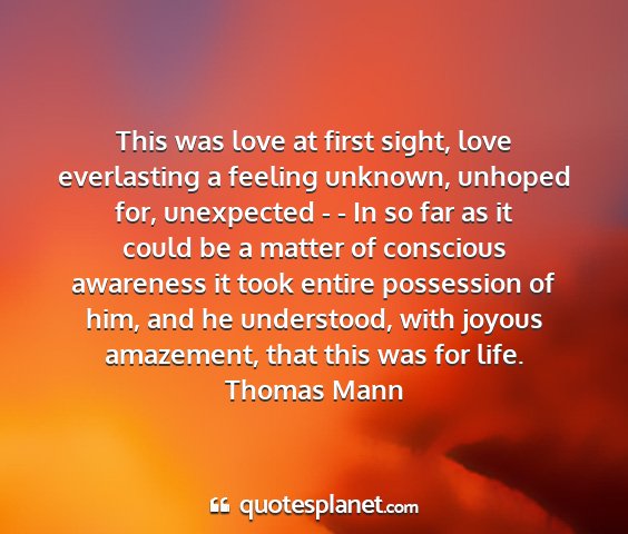 This was love at first sight, love everlasting a feeling unknown, unhoped for, unexpected - - In so far as it could be a matter of conscious awareness it took entire possession of him, and he understood, with joyous amazement, that this was for life.Thomas Mann