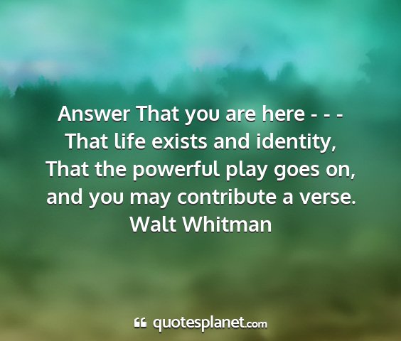 Answer That you are here - - - That life exists and identity, That the powerful play goes on, and you may contribute a verse.Walt Whitman