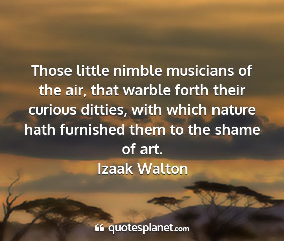 Those little nimble musicians of the air, that warble forth their curious ditties, with which nature hath furnished them to the shame of art.Izaak Walton