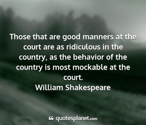 Those that are good manners at the court are as ridiculous in the country, as the behavior of the country is most mockable at the court.William Shakespeare