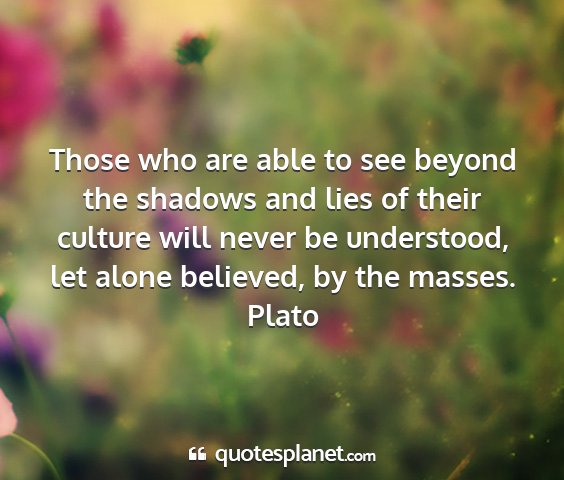 Those who are able to see beyond the shadows and lies of their culture will never be understood, let alone believed, by the masses.Plato