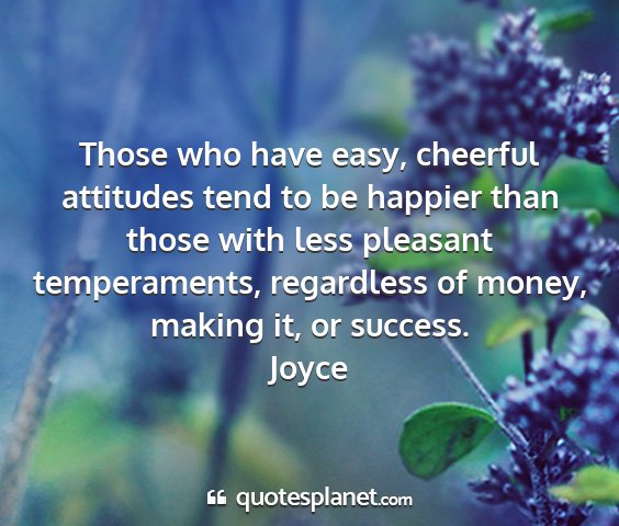 Those who have easy, cheerful attitudes tend to be happier than those with less pleasant temperaments, regardless of money, making it, or success.Joyce