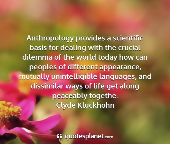 Anthropology provides a scientific basis for dealing with the crucial dilemma of the world today how can peoples of different appearance, mutually unintelligible languages, and dissimilar ways of life get along peaceably togethe.Clyde Kluckhohn