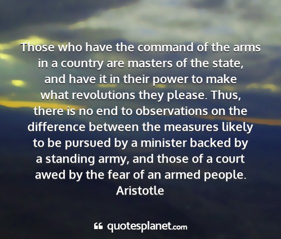 Those who have the command of the arms in a country are masters of the state, and have it in their power to make what revolutions they please. Thus, there is no end to observations on the difference between the measures likely to be pursued by a minister backed by a standing army, and those of a court awed by the fear of an armed people.Aristotle