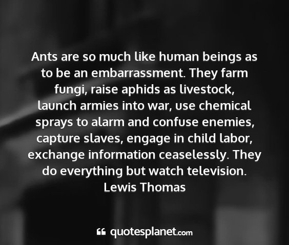 Ants are so much like human beings as to be an embarrassment. They farm fungi, raise aphids as livestock, launch armies into war, use chemical sprays to alarm and confuse enemies, capture slaves, engage in child labor, exchange information ceaselessly. They do everything but watch television.Lewis Thomas