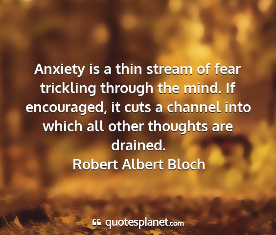 Anxiety is a thin stream of fear trickling through the mind. If encouraged, it cuts a channel into which all other thoughts are drained.Robert Albert Bloch