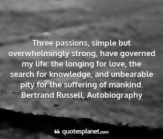 Three passions, simple but overwhelmingly strong, have governed my life: the longing for love, the search for knowledge, and unbearable pity for the suffering of mankind.Bertrand Russell, Autobiography