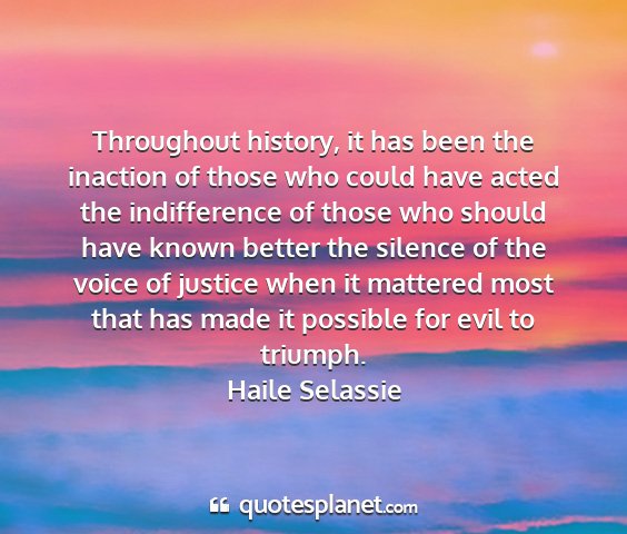 Throughout history, it has been the inaction of those who could have acted the indifference of those who should have known better the silence of the voice of justice when it mattered most that has made it possible for evil to triumph.Haile Selassie