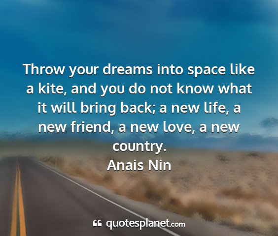 Throw your dreams into space like a kite, and you do not know what it will bring back; a new life, a new friend, a new love, a new country.Anais Nin