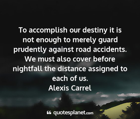 To accomplish our destiny it is not enough to merely guard prudently against road accidents. We must also cover before nightfall the distance assigned to each of us.Alexis Carrel