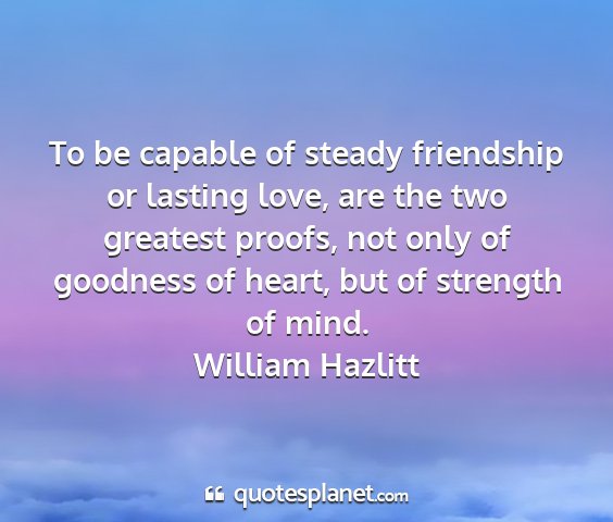 To be capable of steady friendship or lasting love, are the two greatest proofs, not only of goodness of heart, but of strength of mind.William Hazlitt