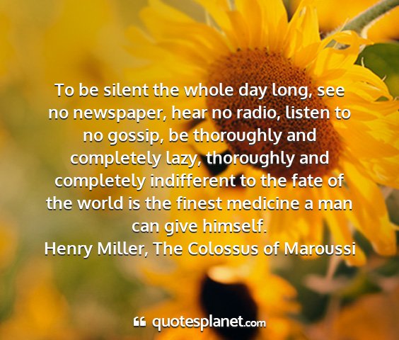 To be silent the whole day long, see no newspaper, hear no radio, listen to no gossip, be thoroughly and completely lazy, thoroughly and completely indifferent to the fate of the world is the finest medicine a man can give himself.Henry Miller, The Colossus of Maroussi