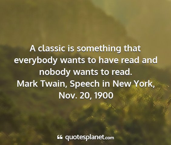 A classic is something that everybody wants to have read and nobody wants to read.Mark Twain, Speech in New York, Nov. 20, 1900