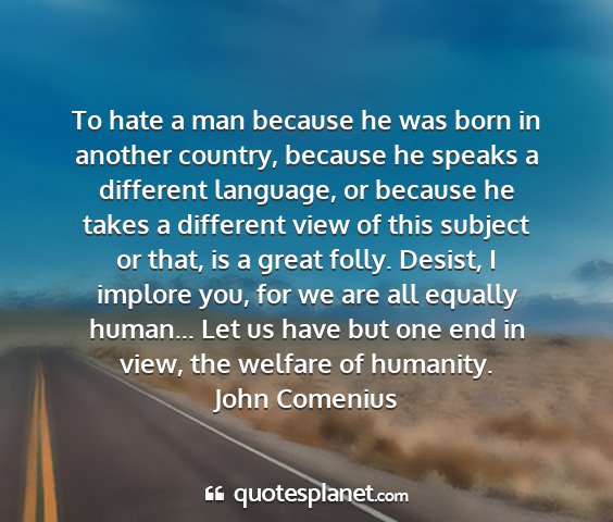 To hate a man because he was born in another country, because he speaks a different language, or because he takes a different view of this subject or that, is a great folly. Desist, I implore you, for we are all equally human... Let us have but one end in view, the welfare of humanity.John Comenius