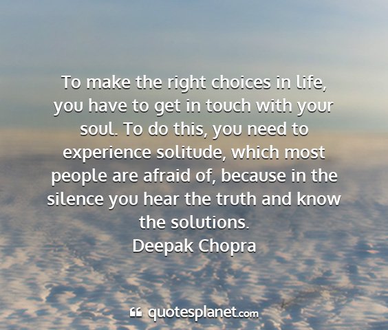 To make the right choices in life, you have to get in touch with your soul. To do this, you need to experience solitude, which most people are afraid of, because in the silence you hear the truth and know the solutions.Deepak Chopra