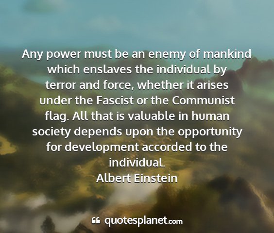 Any power must be an enemy of mankind which enslaves the individual by terror and force, whether it arises under the Fascist or the Communist flag. All that is valuable in human society depends upon the opportunity for development accorded to the individual.Albert Einstein