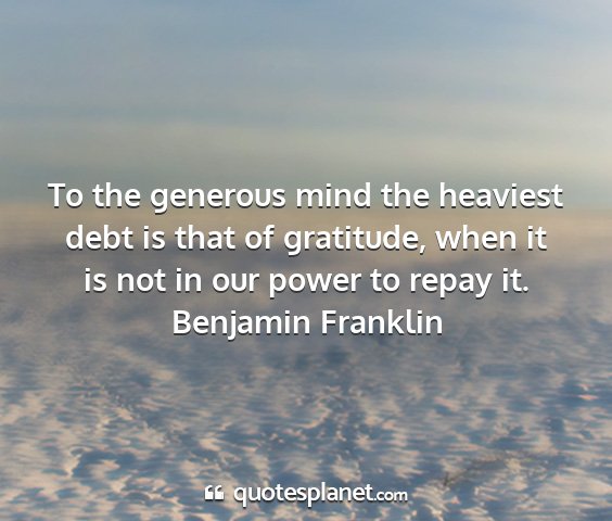 To the generous mind the heaviest debt is that of gratitude, when it is not in our power to repay it.Benjamin Franklin