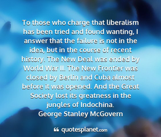 To those who charge that liberalism has been tried and found wanting, I answer that the failure is not in the idea, but in the course of recent history. The New Deal was ended by World War II. The New Frontier was closed by Berlin and Cuba almost before it was opened. And the Great Society lost its greatness in the jungles of Indochina.George Stanley McGovern