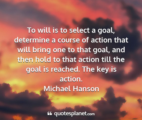 To will is to select a goal, determine a course of action that will bring one to that goal, and then hold to that action till the goal is reached. The key is action.Michael Hanson