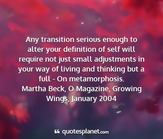 Any transition serious enough to alter your definition of self will require not just small adjustments in your way of living and thinking but a full - On metamorphosis.Martha Beck, O Magazine, Growing Wings, January 2004