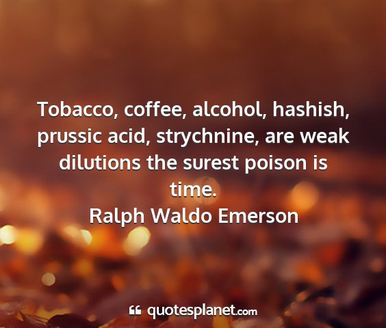 Tobacco, coffee, alcohol, hashish, prussic acid, strychnine, are weak dilutions the surest poison is time.Ralph Waldo Emerson