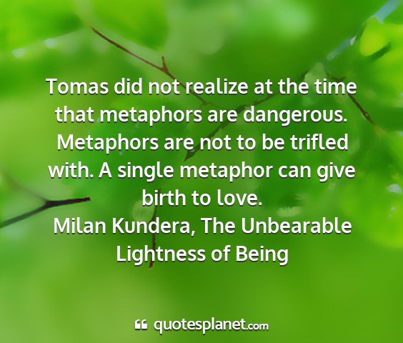 Tomas did not realize at the time that metaphors are dangerous. Metaphors are not to be trifled with. A single metaphor can give birth to love.Milan Kundera, The Unbearable Lightness of Being