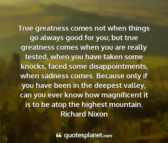 True greatness comes not when things go always good for you; but true greatness comes when you are really tested, when you have taken some knocks, faced some disappointments, when sadness comes. Because only if you have been in the deepest valley, can you ever know how magnificent it is to be atop the highest mountain.Richard Nixon