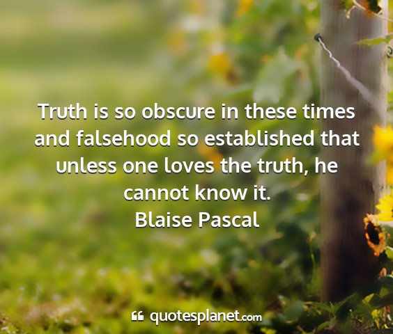 Truth is so obscure in these times and falsehood so established that unless one loves the truth, he cannot know it.Blaise Pascal