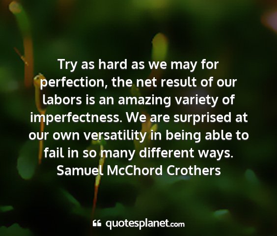 Try as hard as we may for perfection, the net result of our labors is an amazing variety of imperfectness. We are surprised at our own versatility in being able to fail in so many different ways.Samuel McChord Crothers