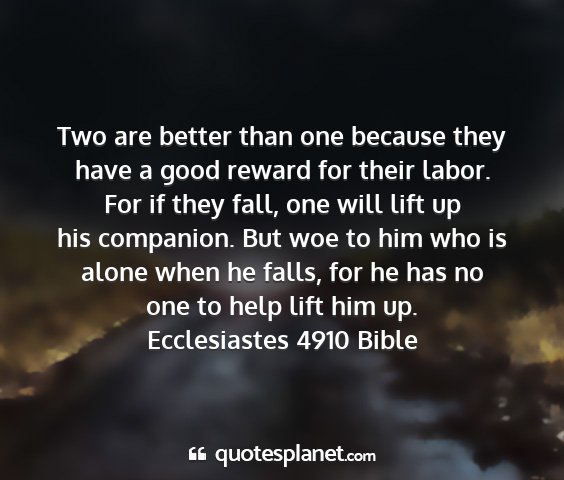 Two are better than one because they have a good reward for their labor. For if they fall, one will lift up his companion. But woe to him who is alone when he falls, for he has no one to help lift him up.Ecclesiastes 4910 Bible