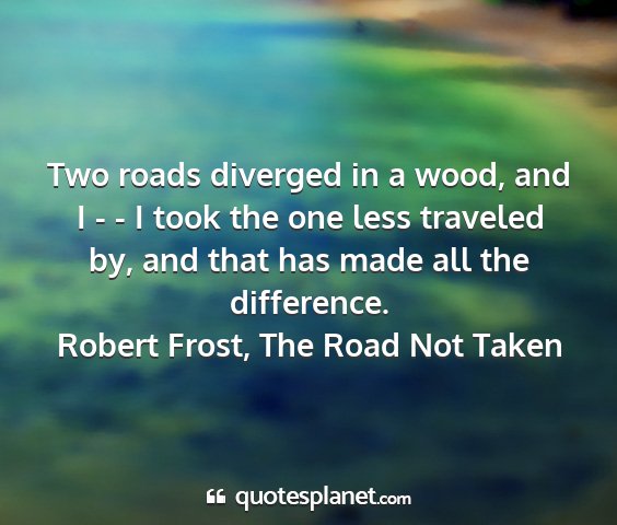 Two roads diverged in a wood, and I - - I took the one less traveled by, and that has made all the difference.Robert Frost, The Road Not Taken