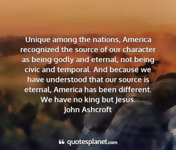 Unique among the nations, America recognized the source of our character as being godly and eternal, not being civic and temporal. And because we have understood that our source is eternal, America has been different. We have no king but Jesus.John Ashcroft