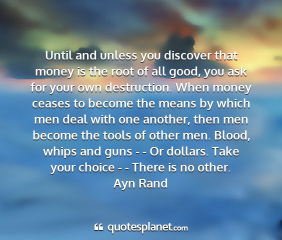 Until and unless you discover that money is the root of all good, you ask for your own destruction. When money ceases to become the means by which men deal with one another, then men become the tools of other men. Blood, whips and guns - - Or dollars. Take your choice - - There is no other.Ayn Rand