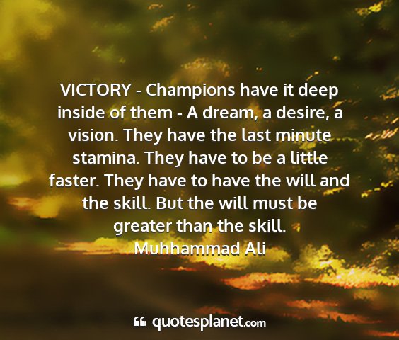 VICTORY - Champions have it deep inside of them - A dream, a desire, a vision. They have the last minute stamina. They have to be a little faster. They have to have the will and the skill. But the will must be greater than the skill.Muhhammad Ali