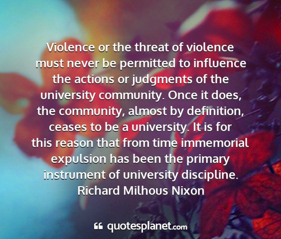Violence or the threat of violence must never be permitted to influence the actions or judgments of the university community. Once it does, the community, almost by definition, ceases to be a university. It is for this reason that from time immemorial expulsion has been the primary instrument of university discipline.Richard Milhous Nixon