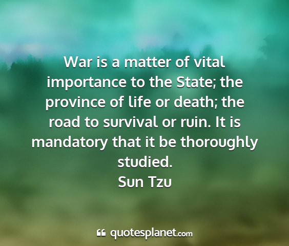 War is a matter of vital importance to the State; the province of life or death; the road to survival or ruin. It is mandatory that it be thoroughly studied.Sun Tzu