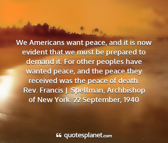 We Americans want peace, and it is now evident that we must be prepared to demand it. For other peoples have wanted peace, and the peace they received was the peace of death.Rev. Francis J. Spellman, Archbishop of New York. 22 September, 1940