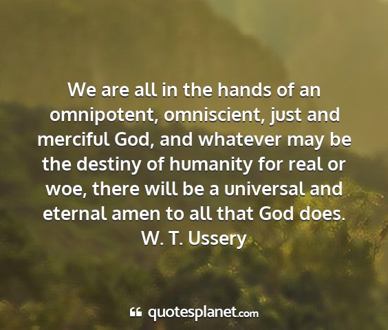 We are all in the hands of an omnipotent, omniscient, just and merciful God, and whatever may be the destiny of humanity for real or woe, there will be a universal and eternal amen to all that God does.W. T. Ussery