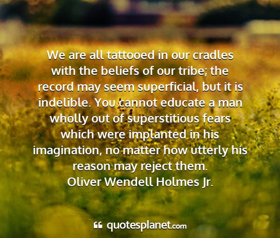 We are all tattooed in our cradles with the beliefs of our tribe; the record may seem superficial, but it is indelible. You cannot educate a man wholly out of superstitious fears which were implanted in his imagination, no matter how utterly his reason may reject them.Oliver Wendell Holmes Jr.