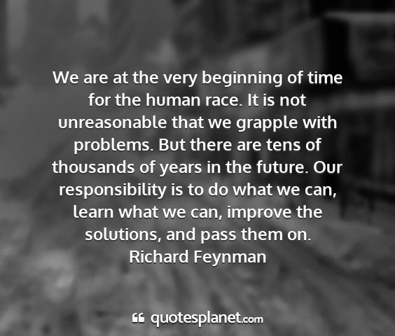 We are at the very beginning of time for the human race. It is not unreasonable that we grapple with problems. But there are tens of thousands of years in the future. Our responsibility is to do what we can, learn what we can, improve the solutions, and pass them on.Richard Feynman