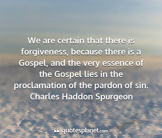 We are certain that there is forgiveness, because there is a Gospel, and the very essence of the Gospel lies in the proclamation of the pardon of sin.Charles Haddon Spurgeon