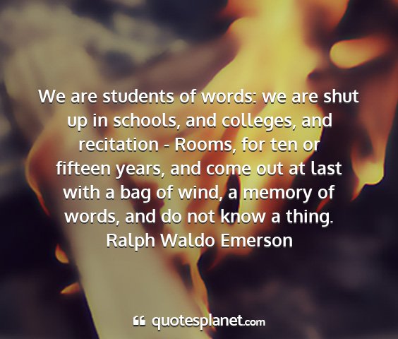 We are students of words: we are shut up in schools, and colleges, and recitation - Rooms, for ten or fifteen years, and come out at last with a bag of wind, a memory of words, and do not know a thing.Ralph Waldo Emerson