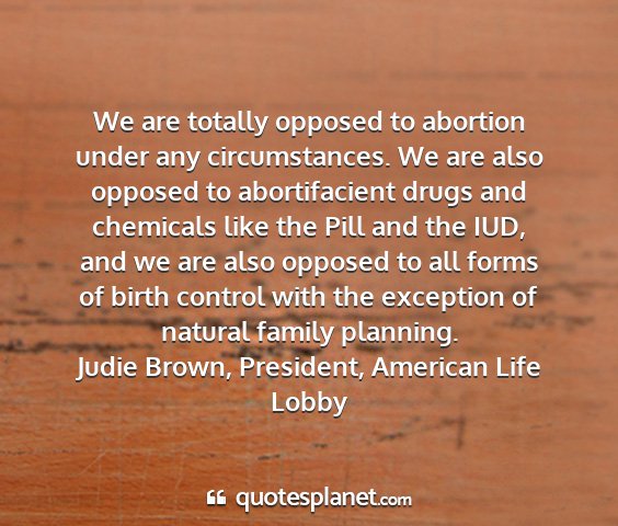 We are totally opposed to abortion under any circumstances. We are also opposed to abortifacient drugs and chemicals like the Pill and the IUD, and we are also opposed to all forms of birth control with the exception of natural family planning.Judie Brown, President, American Life Lobby