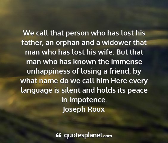 We call that person who has lost his father, an orphan and a widower that man who has lost his wife. But that man who has known the immense unhappiness of losing a friend, by what name do we call him Here every language is silent and holds its peace in impotence.Joseph Roux