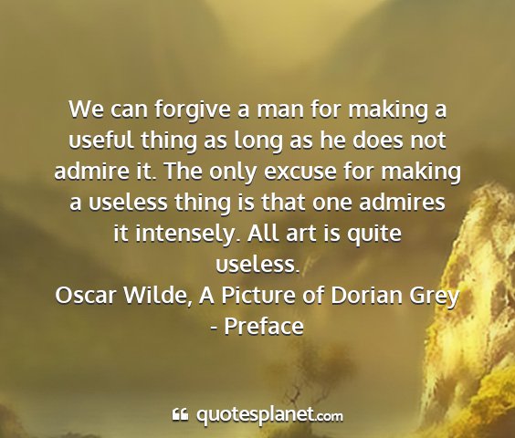 We can forgive a man for making a useful thing as long as he does not admire it. The only excuse for making a useless thing is that one admires it intensely. All art is quite useless.Oscar Wilde, A Picture of Dorian Grey - Preface
