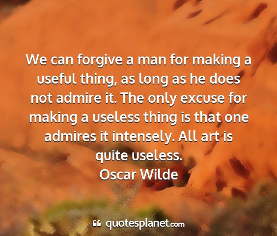 We can forgive a man for making a useful thing, as long as he does not admire it. The only excuse for making a useless thing is that one admires it intensely. All art is quite useless.Oscar Wilde