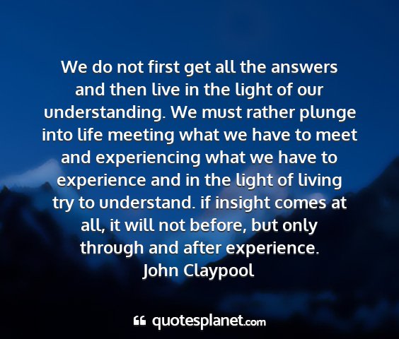 We do not first get all the answers and then live in the light of our understanding. We must rather plunge into life meeting what we have to meet and experiencing what we have to experience and in the light of living try to understand. if insight comes at all, it will not before, but only through and after experience.John Claypool