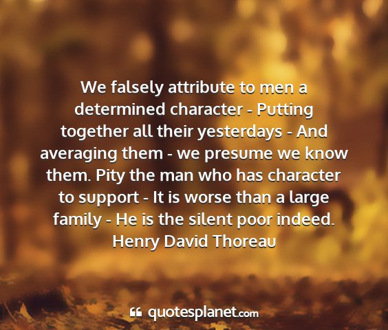 We falsely attribute to men a determined character - Putting together all their yesterdays - And averaging them - we presume we know them. Pity the man who has character to support - It is worse than a large family - He is the silent poor indeed.Henry David Thoreau
