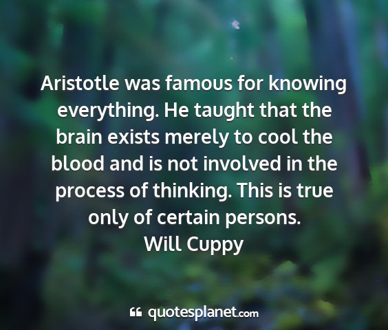 Aristotle was famous for knowing everything. He taught that the brain exists merely to cool the blood and is not involved in the process of thinking. This is true only of certain persons.Will Cuppy