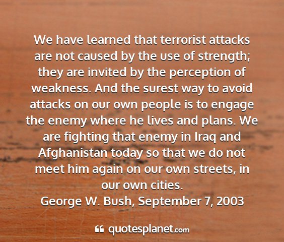 We have learned that terrorist attacks are not caused by the use of strength; they are invited by the perception of weakness. And the surest way to avoid attacks on our own people is to engage the enemy where he lives and plans. We are fighting that enemy in Iraq and Afghanistan today so that we do not meet him again on our own streets, in our own cities.George W. Bush, September 7, 2003